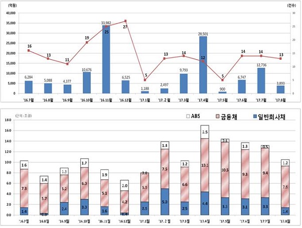 26일 금융감독원의 ‘2017.8월중 기업의 직점금융 조달실적’에 따르면, 지난 8월 중 공모를 통한 기업의 주식‧회사채 발행실적은 총 10조8966억원으로 전월(14조4168억원) 대비 3조5202억원(24.4%) 줄었다.
