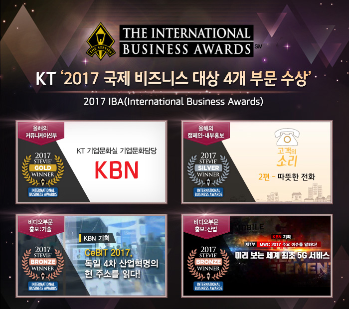 [애플경제=김예지 기자] KT가 오늘 23일, 지난 21일 저녁(현지시각) 스페인 바르셀로나 W호텔에서 개최된 ‘2017 국제 비즈니스 대상(International Business Awards, 이하 IBA)’ 시상식에서 KT그룹 사내방송인 KBN(KT Group Broadcasting Network)이 4개 부문에서 수상했다고 밝혔다.