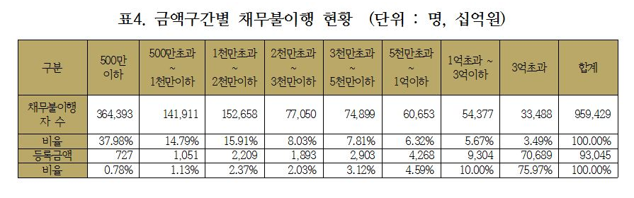 [애플경제=이해리 기자] 금융기관에 등록된 채무불이행자 95만9429명 중 약 38%에 해당하는 36만4393명이 500만원 이하 대출자인 것으로 드러났다.
