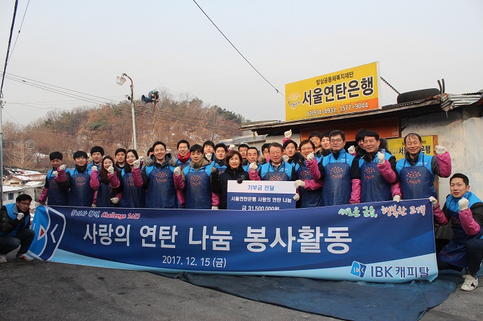한편, IBK캐피탈은 이번 연탄 나눔 봉사활동 외에도 재활원 장애인차량 기증, 포항지진피해복구성금 기부, 단체헌혈 등 다양한 사회공헌활동을 이어오고 있다.