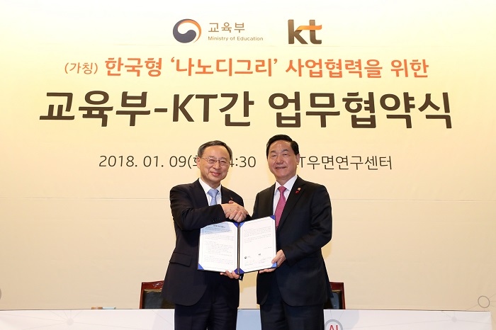 [애플경제=이윤순 기자] KT와 교육부가 ‘4차 산업혁명’의 핵심인 인공지능(AI) 분야의 인력양성을 위해 손을 맞잡고, 실무형 인재 배출에 박차를 가한다. KT가 교육부와 지난 9일 서울 우면동 KT연구개발센터에서 ‘한국형 나노디그리(가칭)’ 사업을 위한 전략적 업무협약(MOU)을 맺었다고 밝혔다.