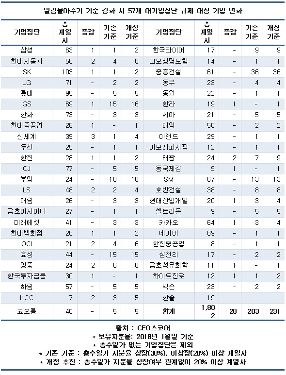 그러나 공정위가 상장사와 비상장사 구분 없이 기준을 20%로 하향하게 되면 규제 대상 기업은 28곳 늘어난 231곳이 해당된다.