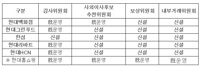 현대홈쇼핑의 경우 이미 이사회 안에 감사위원회·사외이사후보추천위원회·보상위원회·내부거래위원회 등 4개 위원회를 운영 중이다.