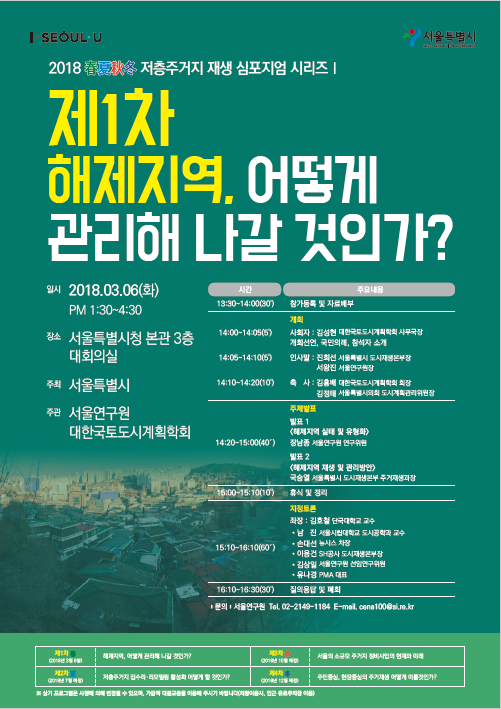 서울연구원 장남종 연구위원이 ‘뉴타운·재개발 해제지역 실태분석 및 유형화’ 주제로 발표하고, 이어 서울시 국승열 주거재생과장이 ‘해제지역 재생 및 관리방안’을 주제로 발표하게 된다.