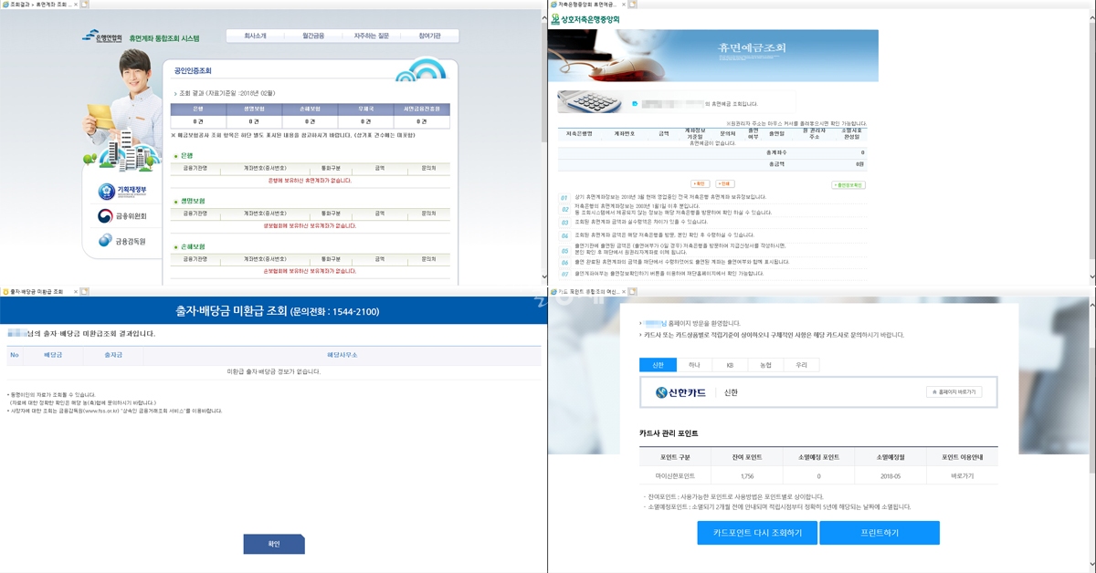 하위 카테고리를 통해 은행 휴면예금 신탁(금융결제원), 저축은행 휴면예금(상호저축은행중앙회), 휴면보험금(은행연합회), 협동조합 휴면예금(농협·수협·신협·산림조합·새마을금고), 자동차 과납보험료(보험개발원), 휴면성증권(금융투자협회), 미수령주식(한국예탁결제원), 카드포인트(여신금융협회), 파산금융기관 미수령금(예금보험공사), 미환급 공과금(민원24) 등을 확인할 수 있다.
