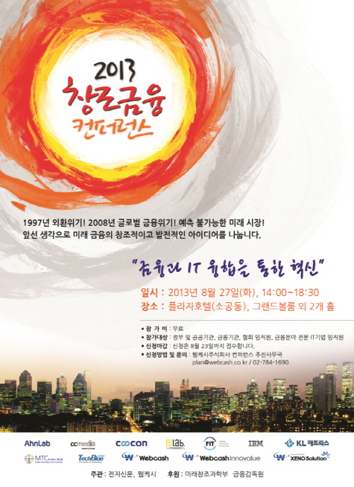 미래창조과학부와 금융감독원이 후원하고, 전자신문사와 웹케시가 주관하는 이번 행사에서는 대표적인 금융 및 IT기업들이 참여해서 “금융과 IT융합을 통한 혁신”을 주제로 다양한 발표와 토론을 진행할 예정이다.