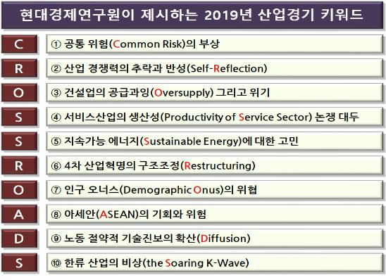 현대경제연구원은 2019년 산업경기의 키워드로 『기로(CROSSROADS)』를 제시한다. 이는 다음과 같은 2019년 산업경기의 10대 특징을 나타내는 각 핵심용어의 첫 영문자를 조합한 것이다.