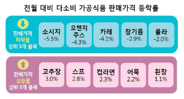 어묵이 13.1%로 가장 많이 올랐고, 즉석밥 10.7%, 간장과 설탕은 각각 6.4%씩 올랐다. 반면 냉동만두와 식용유, 커피믹스 등 9개 제품의 값은 떨어졌다.
