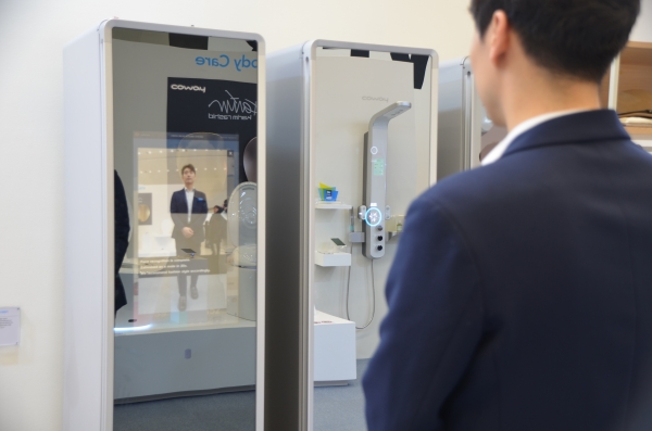코웨이가 선보인 전시품 중엔 미국 온라인 쇼핑몰 기업 아마존과 협업한 ‘의류청정기’가 눈에 띄었다. 아직 개발 단계의 제품으로, 인공 환기 기능 등으로 의류를 청결하게 하는 제품의 전면에 디스플레이와 카메라, 네트워크 기술 등을 접목했다.