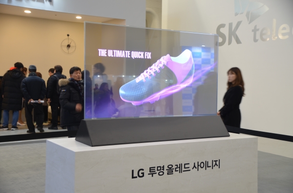 함께 선보인 투명 올레드 사이니지는 LG가 선보인 새로운 형태의 디스플레이 광고물이다. 기존 투명 디스플레이의 경우 투명한 유리의 하단부에서 빛을 쏘아 올려서 상이 맺히도록 하는 방식이었기 때문에, 빛이 가장 늦게 닿는 상단은 해상도가 떨어질 수밖에 없었다.