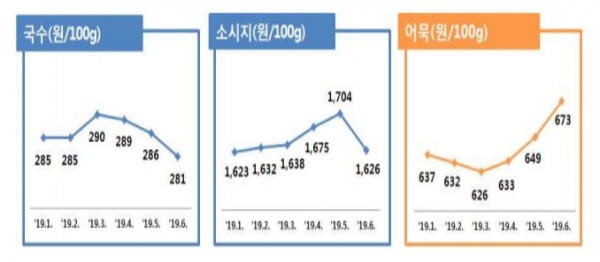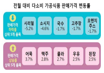 지난달(5월) 대비 가격이 하락한 품목은 시리얼(-5.2%)·소시지(-4.6%)·국수(-1.7%) 등 14개였다. 특히 국수는 최근 3개월 연속 가격이 하락했으며, 지난 1월 이후 가격이 상승했던 소시지는 6월 들어 가격이 내렸다.