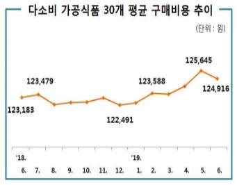 3월 이후 계속 상승세이던 다소비 가공식품 30개 품목의 평균구매비용은 전월(5월) 대비 0.6% 떨어졌다. 작년 같은 달과 비교했을 때는 1.4% 올랐다. 소주·생수·식용유·라면·설탕의 가격은 변화가 없었다.