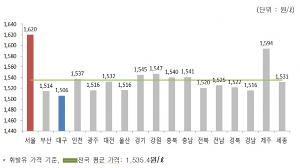 전국 최고가 지역인 서울 휘발유 가격은 2.1원 상승한 1ℓ에 1,620원, 최저가 지역인 대구는 1.4원 오른 1,506.3원이었다.