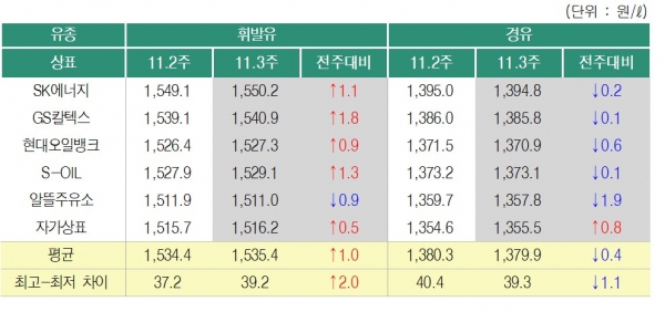 가장 비싼 상표인 SK에너지 휘발유는 1ℓ에 1,550.2원, 최저가 상표인 알뜰주유소 휘발윳값은 1,511.0원을 나타냈다.