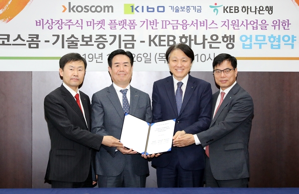 KEB하나은행은 26일 서울시 영등포구 코스콤 비전룸에서 기술보증기금, 코스콤과 블록체인 기반의 '비상장주식 마켓 플랫폼(Be My Unicorn)'에 지식재산 금융서비스를 제공하기 위한 업무협약을 체결했다고 27일 밝혔다.