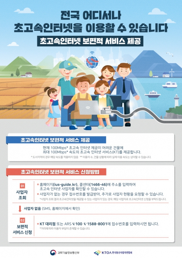 시내전화, 공중전화에 이어 초고속인터넷 서비스도 보편적 서비스로 지정됐다. 전국 어디서나 서비스 이용을 요청하면 초고속인터넷 서비스를 쓸 수 있게 됐다. 지금까지는 통신분야 보편적 서비스는 시내전화, 공중전화, 도서통신, 선박통신이었지만 올해부터 초고속 인터넷도 모든 지역의 국민이 요청하면 통신사들이 제공해야 하는 보편적 서비스가 됐기 때문이다. 과학기술정보통신부는 1월부터 초고속 인터넷이 보편적 서비스로 지정됐다고 5일 밝혔다. 우리나라는 세계에서 8번째로 초고속인터넷을 보편적 서비스로 제공하지만, 지정 국가 중에서 가장 빠른 속도인 100Mbps로 제공한다. 대상은 88만 개 건물이다.