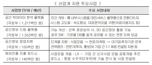 산업계 발전을 위한 국가지원사업도 개선되어 추진된다. 공간정보 활용기반 확충을 위해 빅데이터 분석 플랫폼의 민간 개방, 공간정보 드림 활용환경 개선 등이 추진되며, 산업계 육성을 위해 창업지원사업, 해외진출 지원 로드쇼 등 산업지원사업도 강화된다.