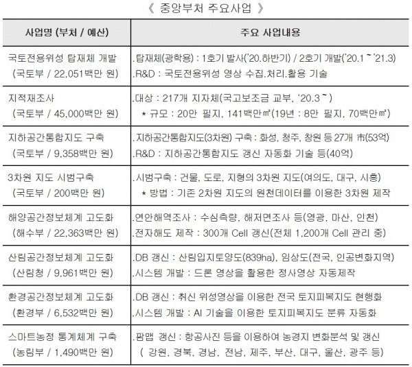 해수부는 연안해역 조사 사업, 환경부는 자연환경 지리정보 데이터 베이스 구축, 농림부는 팜맵(Farm-map) 갱신 및 활용서비스 구축, 산림청은 산사태 위험지도 구축 등도 추진한다.