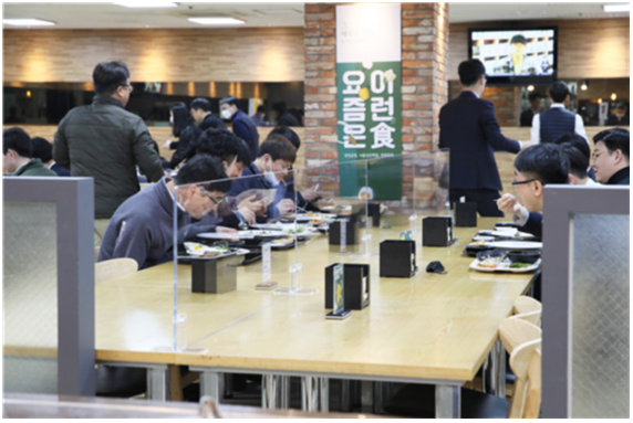 많은 직원이 일시에 모이는 구내식당의 경우 4부제로 운영하며 여유 공간을 식사 공간으로 추가 활용하고, 식사 테이블 2개를 마주 붙여 거리를 2m 이상으로 하면서도 중간에 투명 아크릴 칸막이를 설치하여 마주보며 식사 할 수 있도록 하고 있다.