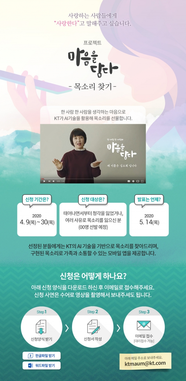 목소리 찾기 프로젝트 참여는 KT 홈페이지(www.kt.com)에서 신청서를 내려 받아, 이메일(ktmaum@kt.com)로 신청할 수 있다. 글보다 수어가 편한 사람은 목소리를 찾고 싶은 사연을 영상으로 보낼 수 있으며, 대리인의 신청도 가능하다.