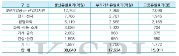 업종별로는 SW개발공급·산업디자인, 전기·전자, 생명과학의 경제적 파급효과가 다른 업종에 비해 상대적으로 크게 나타났다.