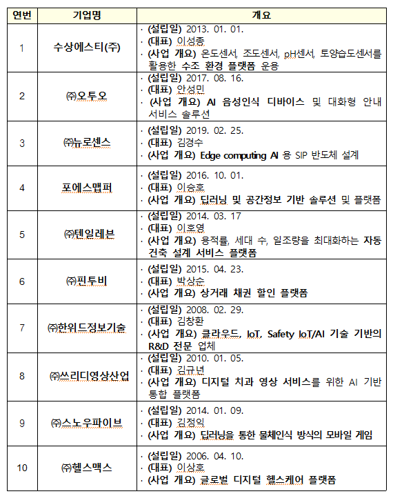 이 날 행사에서는 수상에스티, 오투오, 뉴로센스, 포에스맵퍼, 텐일레븐, 핀투비, 한위드정보기술, 쓰리디영상산업, 스노우파이브, 헬스맥스 등 총 10개 ICT 혁신 선도기업이 참여, 투자유치를 위한 자사의 기술 설명, 비전 제시 등 열띤 홍보가 이어졌다.