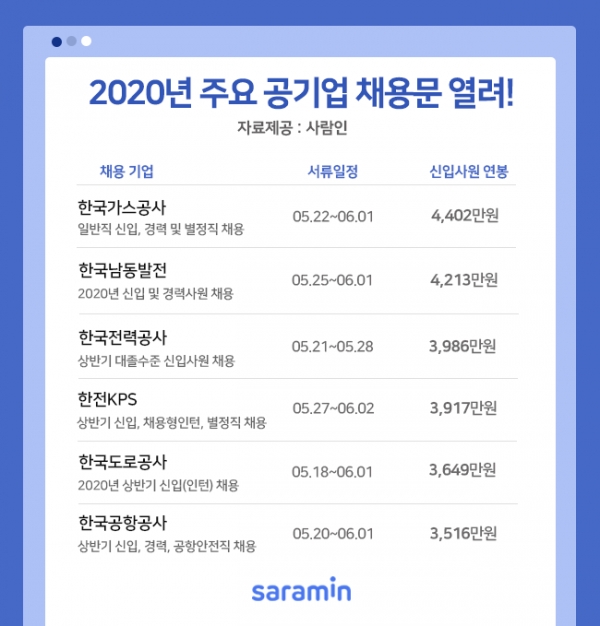 이에 구인구직 매칭 플랫폼 사람인이 2020년 상반기 주요 공기업 채용 소식을 정리했다고 21일 밝혔다.