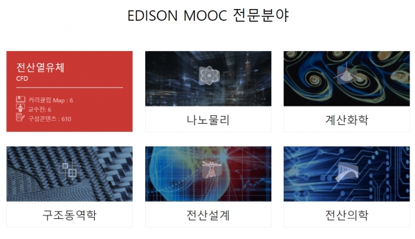 특히 지난 3월 16일부터 서비스 되고 있는 EDISON MOOC(https://elearning.edison.re.kr)는 이공계 분야의 기본 이론을 설명하는 강의를 제공함과 동시에 이를 확인해 볼 수 있는 시뮬레이션 SW를 함께 실행할 수 있는 환경을 갖추고 있다. EDISON MOOC는 현재 6개 분야(전산열유체, 나노물리, 계산화학, 구조동역학, 전산설계, 전산의학), 13개 대학의 교수진이 제작한 총 23개 과목의 영상·실습 콘텐츠를 탑재하여 서비스하고 있다.