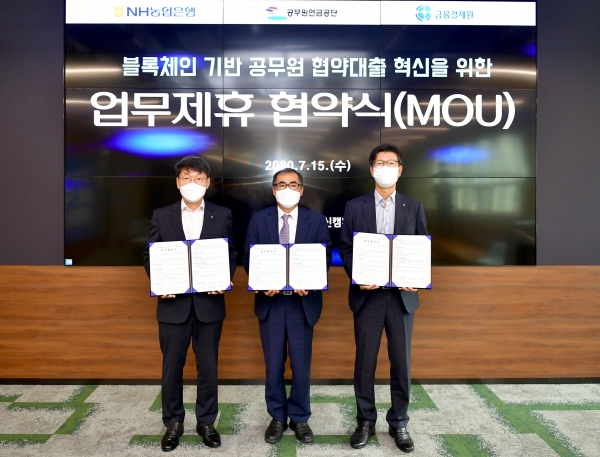 NH농협은행은 15일 서울 서초구 소재 NH디지털혁신캠퍼스에서 공무원연금공단, 금융결제원과 공무원 협약대출 블록체인화 서비스 공동 사업을 위한 업무협약을 체결했다고 밝혔다.
