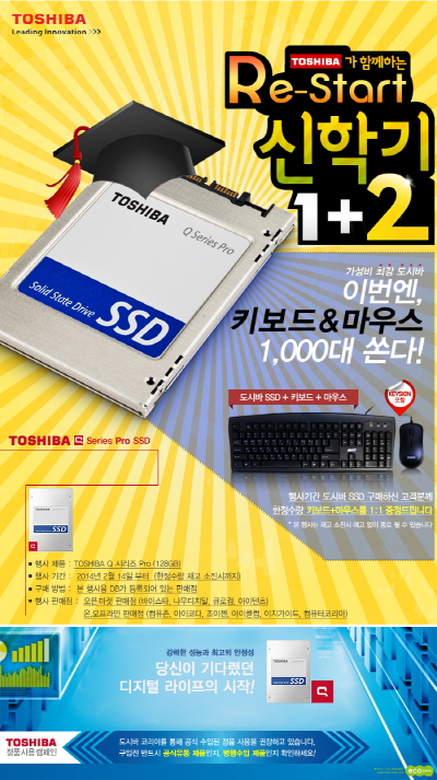 도시바 일렉트로닉스 코리아의 스토리지 총판 대리점인 주영통신은 신학기를 맞이해, 도시바 SSD 구매고객을 대상으로 한정수량 키보드와 마우스를 증정하는 ‘Re-start 신학기 1+2’ 이벤트를 진행한다고 밝혔다.