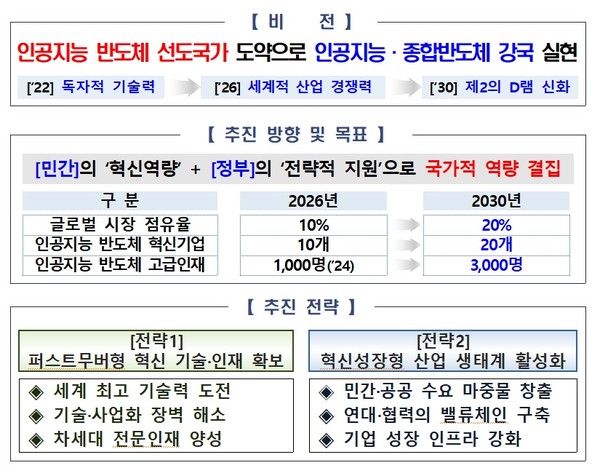 정부는 ‘인공지능 반도체 선도국가 도약으로 인공지능·종합반도체 강국 실현’을 비전으로, 2030년까지 글로벌 시장 점유율 20%, 혁신기업 20개, 고급인재 3,000명 양성을 위한 2대 추진전략과 6대 실행과제를 마련했다.