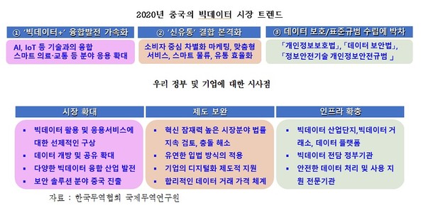 보고서는 “최근 중국 빅데이터 시장 트렌드는 ‘빅데이터+’ 융합 발전 가속화, 신유통 결합 본격화, 데이터 보호·표준규범 수립”이라면서 “중국이 자국 데이터 통제와 중국 중심의 표준규범 수립에 박차를 가하면서 중국 시장 확대를 도모하는 해외기업에 제동을 걸고 있어 주의가 필요하다”고 말했다.