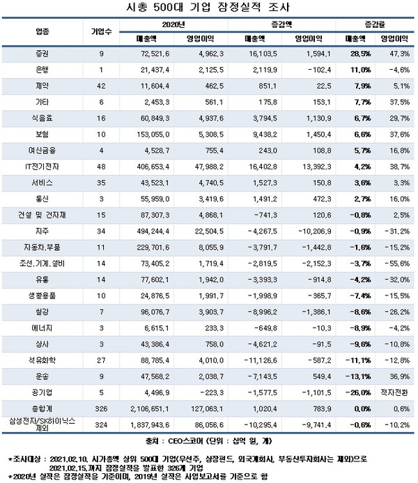 CEO스코어, 시총 500대 기업 2019년 대비 2020년 매출·영업익·당기순익 조사