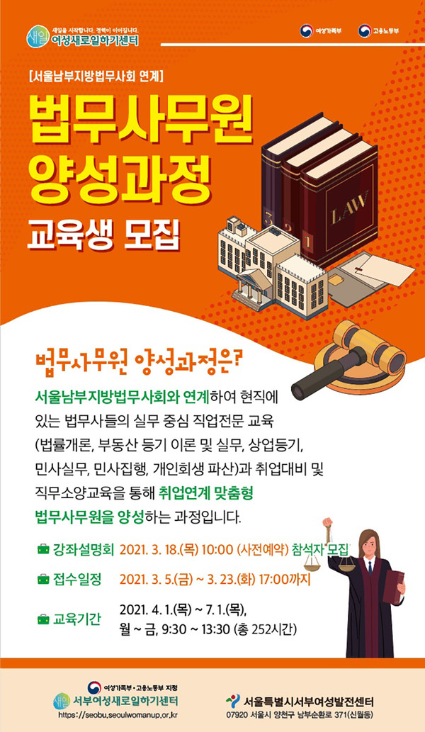 서울특별시서부여성발전센터에서 운영할 법무사무원 양성과정은 서울남부지방법무사회와 연계해 현직에 있는 법무사들의 실무 중심 직업전문 교육 뿐아니라 직무소양교육 및 취업대비교육, 기관탐방 등 법무사무원들이 갖추어야 할 이론 및 실무교육 중심 교육으로 취업연계 맞춤형 법무사무원을 양성하는 교육과정이다. 훈련 수료 후 법률관련 기관의 법무사무원으로 취업이 가능하다.