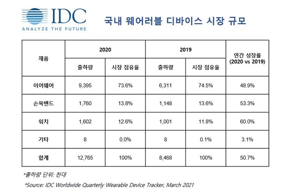IT 시장분석 및 컨설팅 기관 인터내셔날데이터코퍼레이션코리아(이하 한국IDC)는 최근 국내 웨어러블 연구조사에서 2020년 국내 웨어러블 디바이스 시장이 1276만대를 출하하며 전년 대비 50.7% 성장했다고 밝혔다.