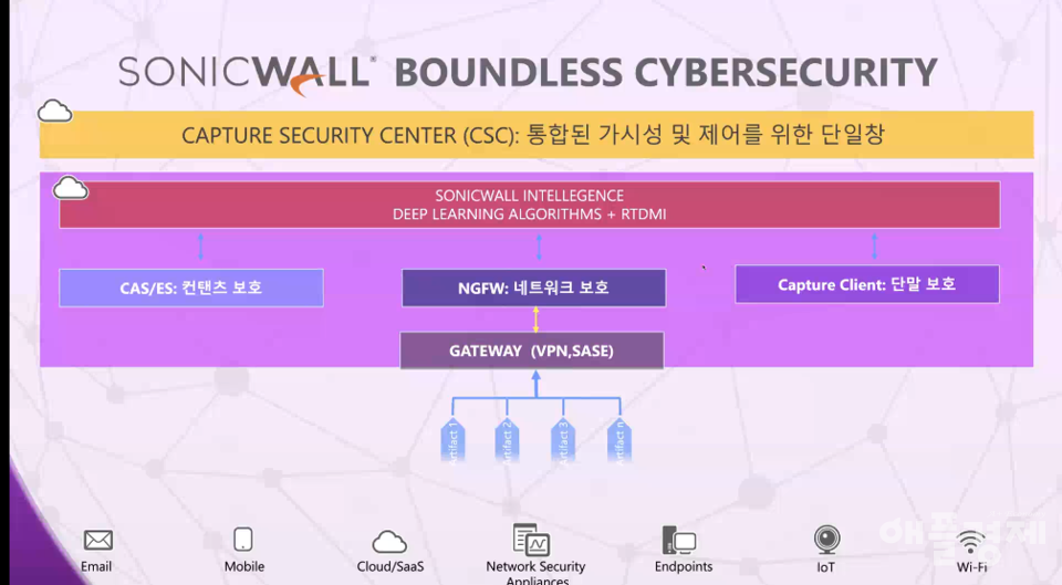 소닉월의 ‘경계없는 사이버 보안’ 모델은 게이트웨이를 통한 제로 트러스트 지원을 핵심 내용으로 한다. VPN이나 SASE를 이용해 집, 회사, 모바일 등으로 흩어진 환경을 통합 관리하며 콘텐츠·네트워크·기기를 보호하고 인텔리전스 딥러닝 알고리즘을 이용해 알려진·알려지지 않은 위협에 지능적으로 대응한다.