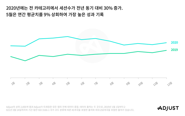 올해는 전년 평균 대비 설치 수 11%, 세션 수 14%의 성장세를 나타내며 연초부터 확고한 성장세를 보이고 있다. 전자상거래의 세션 수는 올해 2월 말 및 3월 초에 가장 높았으며 전년 대비 23% 증가했다.