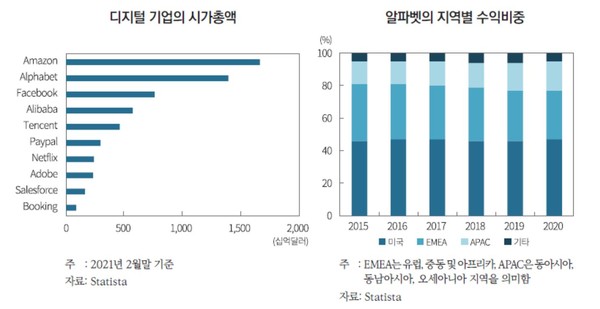 글로벌 디지털 기업의 시가총액 기준 상위 10개 기업 중 알리바바와 텐센트를 제외하고는 모두 미국에 본사를 두고 있는 기업이다.