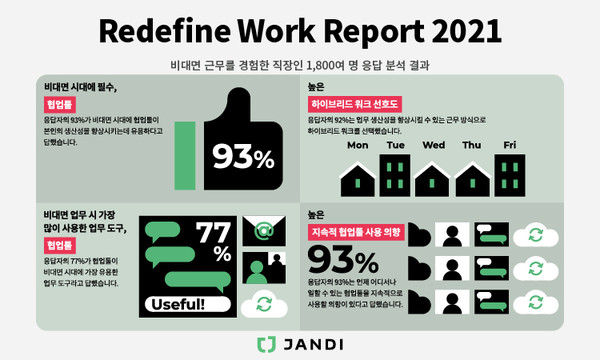 업무용 협업툴 ‘잔디(JANDI)’를 서비스하는 토스랩은 ‘일하는 방식의 재발견(Redefine Work Report 2021)’ 리포트를 발간했다.