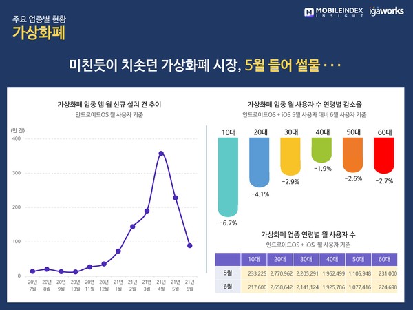 특히 거래대금 기준으로 국내 최대 규모 가상화폐(코인) 거래소인 업비트마저도 애플리케이션(앱) 사용시간이 6월 들어 감소했습니다. 코인 상승장이 시작된 작년 10월 이후 첫 감소라고 합니다.