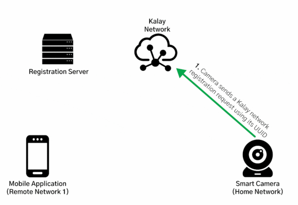 다음 그림은 칼레이 네트워크에서 일반적인 장치 등록 및 클라이언트 연결 프로세스를 보여줍니다. 예제 시나리오는 사용자가 홈 네트워크에 있는 칼레이 지원 카메라를 사용해 원격 네트워크(커피숍 무선 네트워크 또는 이동통신 망)를 통해 모바일 애플리케이션의 카메라 피드에 원격으로 접근하는 것입니다.