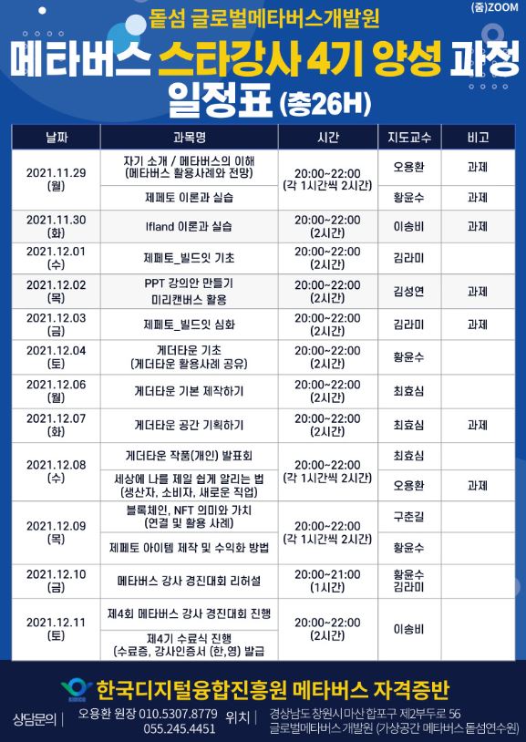 수강 후 ‘메타버스 강사 경진대회’를 통해 통과한 수강생들에게는 글로벌메타버스개발원(원장 오용환)의 강사 인증서와 2022년 1월경 한국디지털융합진흥원(이사장 김대완)의 메타버스 전문강사 민간자격증이 수여된다. 2주간 교육비는 50만원이며 자세한 문의는 055-245-4451 또는 010-5307-8779로 하면 된다.