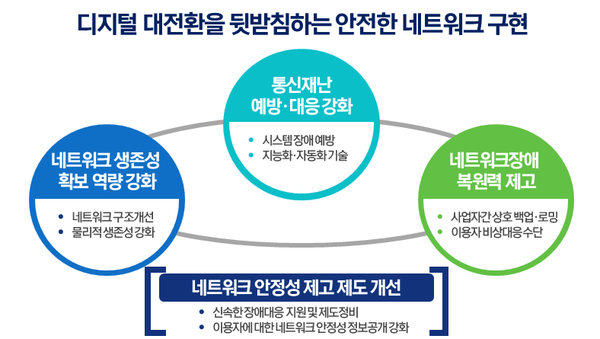 이런 내용을 골자로 한 과기정통부의 ‘네트워크 안정성 확보방안’은 △통신재난 예방 대응강화, △네트워크 생존성 확보 역량 강화, △재난 발생 이후 네트워크 장애 복원력 제고, △‘네트워크 안정성 제고 제도 개선’의 4대 과제로 구성됐다.