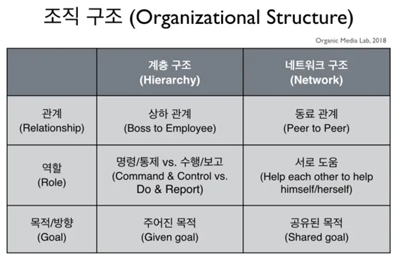 조직형태 역시 변화가 필요하다. 지금 정부나 기업의 조직은 총무, 생산, 판매 등 기능별 조직을 기초로 하여, 위계 질서가 분명한 상명하복 중심의 계층별 수직적 조직이다. 글로벌 기업들은 그 한계를 맞아 이미 사업부제 조직, 메트릭스 조직 등으로 여러 가지 변화를 거듭하고 있지만, 4차 산업혁명 시대에 맞는 조직 형태는 갖추지 못하고 있다. 자율과 분권, 연대와 협력을 바탕으로 자유롭게 소통할 수 있는 수평적 조직인 네트워크 형 조직이 반드시 필요하다.