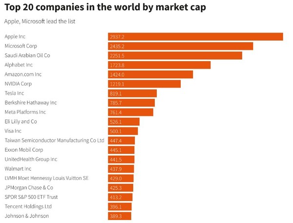 한편 세계 시가총액 20위권을 보면 애플, 마이크로소프트, 사우디 아라비안 국영 오일, 알파벳, 아마존, 엔비디아, 테슬라, 버크셔 해서웨이, 메타, 엘리 릴리, 비자, TSMC, 엑손 모빌, 유나이티드헬스 그룹, 월마트, LVMH 헤네시 루이 뷔통, J.P모건 체이스, S&P500, 텐센트, 존슨&존슨 등이다.
