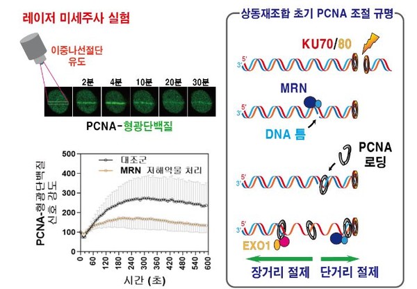 연구팀은 세포에 레이저를 조사해 특정 DNA 부위에 이중나선 절단을 유도한 뒤 형광 표지한 PCNA 단백질의 이동을 실시간으로 관찰했다. 그 결과, PCNA가 수십 초 내에 절단 위치에 나타나고, 일정 시간 이후에 사라지는 것을 확인했다. 연구팀이 MRN 단백질 복합체의 활성을 낮추자 PCNA가 감소하였으며, ATAD5의 양을 줄이면 PCNA가 오래 유지됐다. 이는 이중나선절단이 일어난 직후 MRN 단백질 복합체가 만든 DNA 틈에 PCNA 단백질이 신속하게 결합하고, 일정 시간이 지난 뒤 ATAD5에 의해 DNA에서 분리됨을 의미한다.