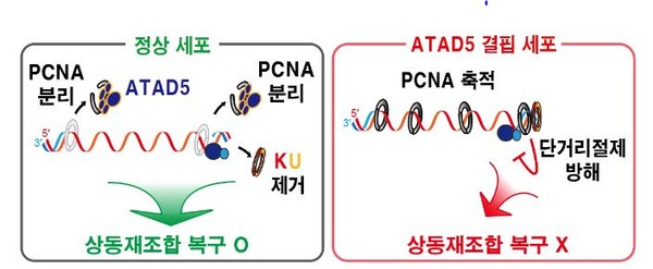 연구팀은 또 ATAD5가 제대로 역할을 하지 못하는 경우에 복구 결함과 게놈 불안정성이 나타나는 메커니즘도 규명했다. 정제 단백질을 이용한 생화학적․세포생물학적 실험을 통해 분석한 결과, 원활한 상동재조합 복구를 위해 말단절제가 진행 중인 DNA로부터 PCNA 분리가 필수였다. 분리되지 않고 남아 있는 PCNA는 DNA 틈으로부터 절단 부위 방향으로 진행되는 말단절제를 방해했다.