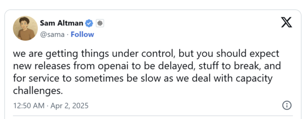 이 과정에서 이용자가 몰리면서 챗GPT 서버에는 과부하가 발생했고, 무료 이용자의 경우 서비스 이용에 어려움을 겪는 사례도 늘어났다. 또한, 무료 사용자는 하루 3개의 이미지만 생성할 수 있도록 제한되면서, 온라인 커뮤니티에서는 챗GPT 이미지 생성이 제한될 경우 이를 우회하는 방법을 공유하는 글도 등장하고 있다. '그록3(Grok-3)'를 활용해 이미지 생성을 이어가는 방법 등이 대표적이다.