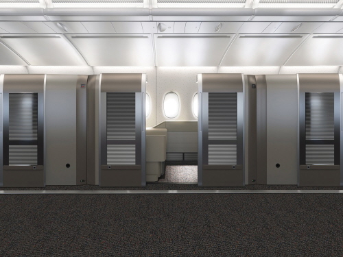 먼저, 퍼스트 클래스 12석 좌석 모두에 양문형 도어를 설치하여 고급 호텔의 스위트룸과 같은 독립된 공간을 조성하였으며 밤 하늘을 연상시키는 스타 라이트 및 프리미엄 드레스룸은 고객으로 하여금 편안하고 안락한 분위기를 느낄 수 있게 해준다.